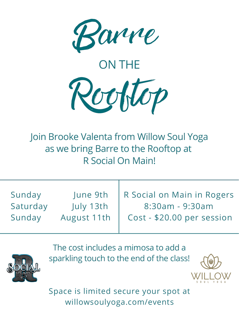 Join us for this special event where Willow Soul Yoga takes Barre out of the studio and onto the rooftop at R Social on Main in Rogers.
